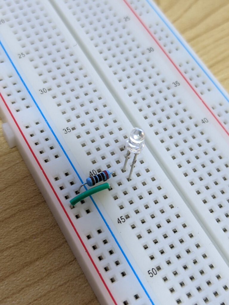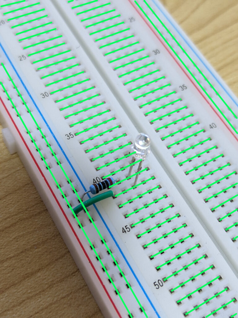 In the terminal strips, each row of 5 points is connected horizonally. This means if we connect a pin (the leg of a component) to a point in a row, the other 4 points are available to make a connection with other components.